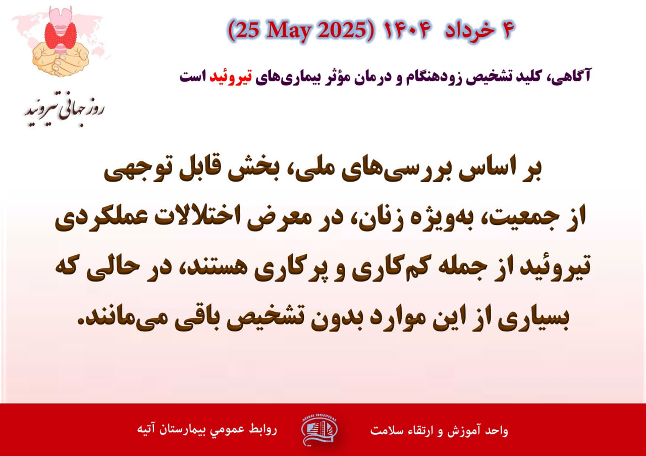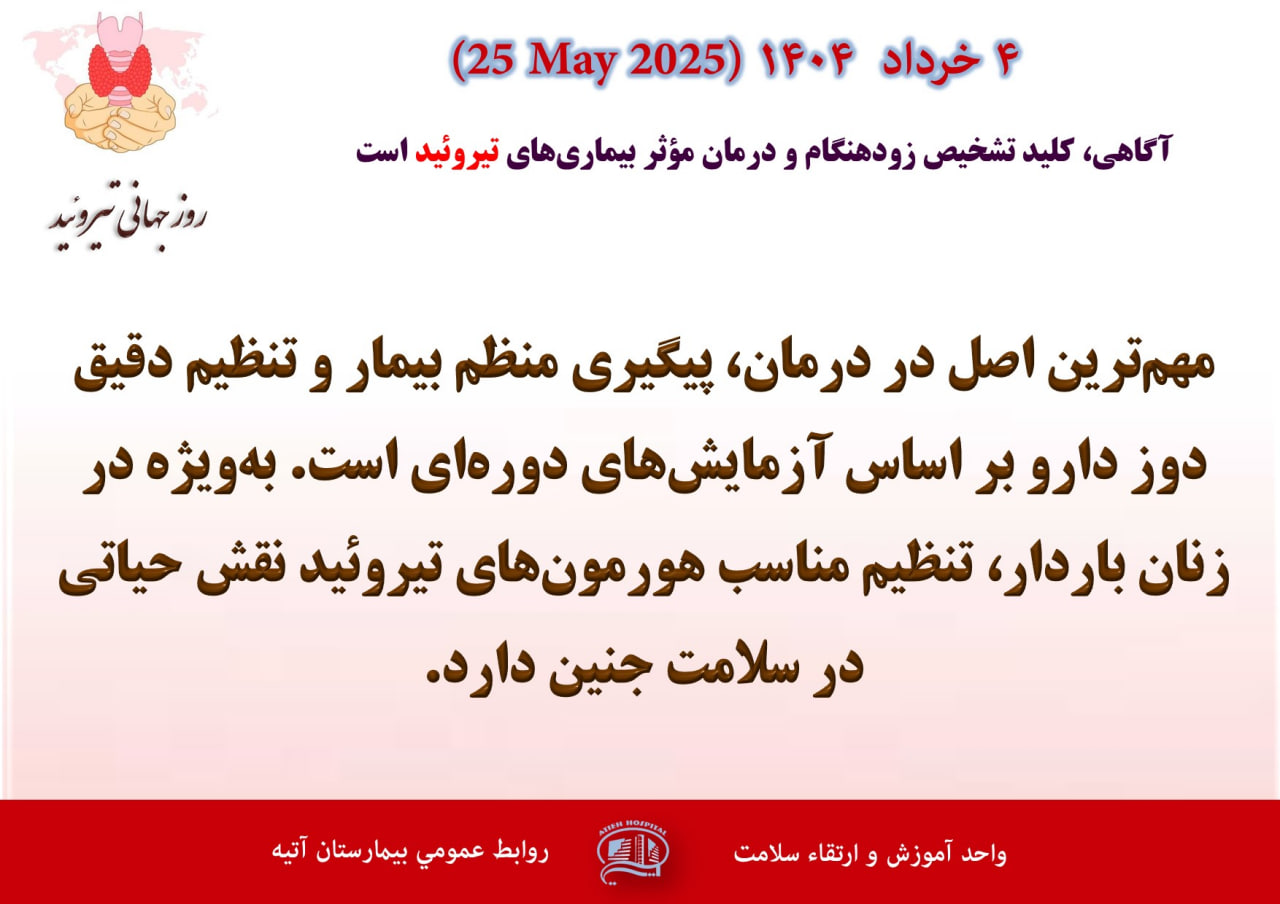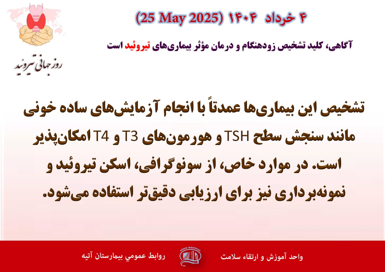 روز جهانی تیروئید هر ساله در ۲۵ مي(۴ خرداد) برگزار میشود و هدف آن افزایش آگاهی عمومی درباره اختلالات تیروئید، تشویق به انجام آزمایشهای غربالگری و حمایت از بیماران است. این روز توسط انجمن تیروئید اروپا (ETA) پایهگذاری شده و با حمایت انجمنهای بینالمللی مانند انجمن تیروئید آمریکا (ATA) و فدراسیون بینالمللی تیروئید (TFI) برگزار میشود.