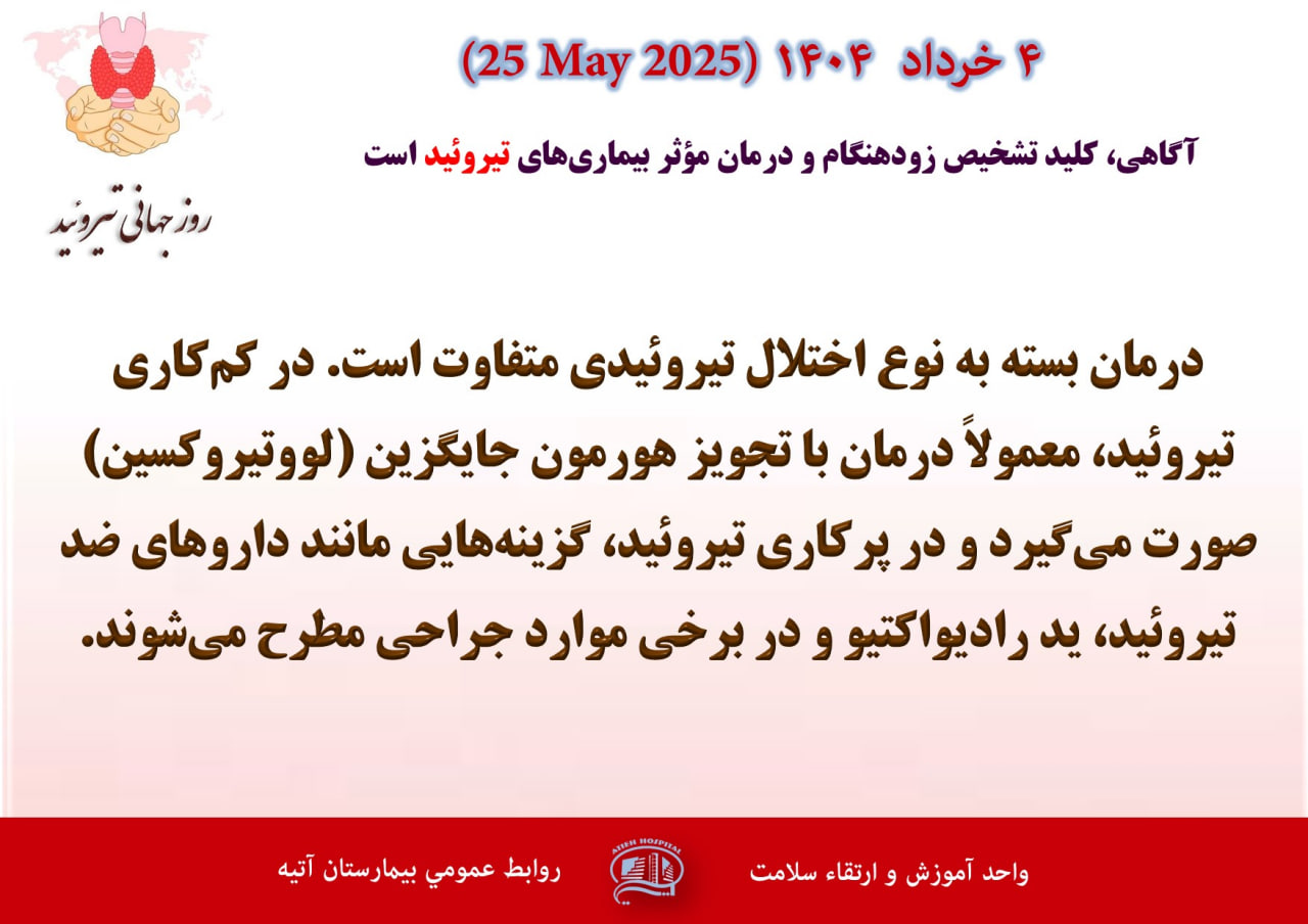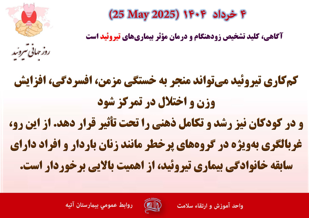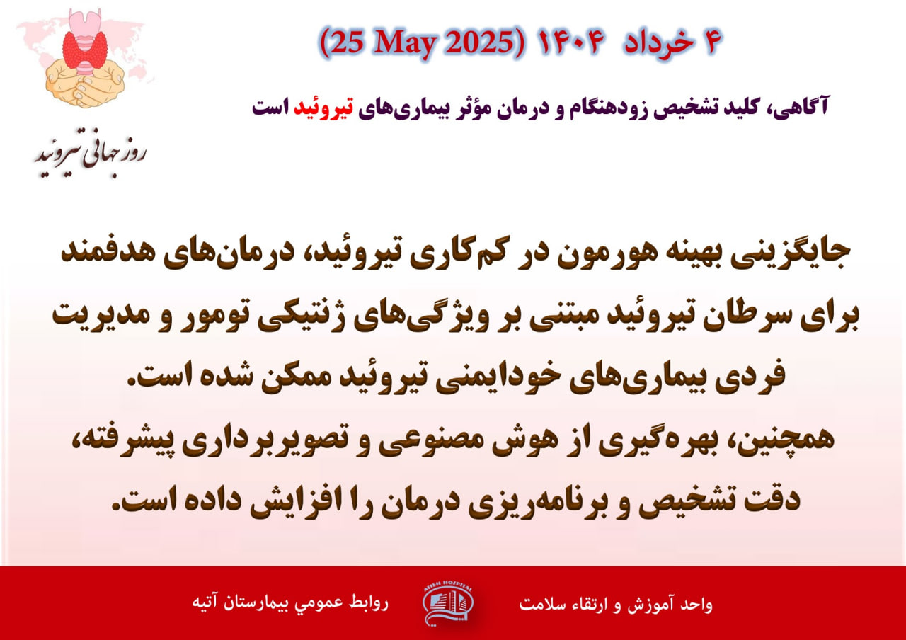 روز جهانی تیروئید هر ساله در ۲۵ مي(۴ خرداد) برگزار میشود و هدف آن افزایش آگاهی عمومی درباره اختلالات تیروئید، تشویق به انجام آزمایشهای غربالگری و حمایت از بیماران است. این روز توسط انجمن تیروئید اروپا (ETA) پایهگذاری شده و با حمایت انجمنهای بینالمللی مانند انجمن تیروئید آمریکا (ATA) و فدراسیون بینالمللی تیروئید (TFI) برگزار میشود.
