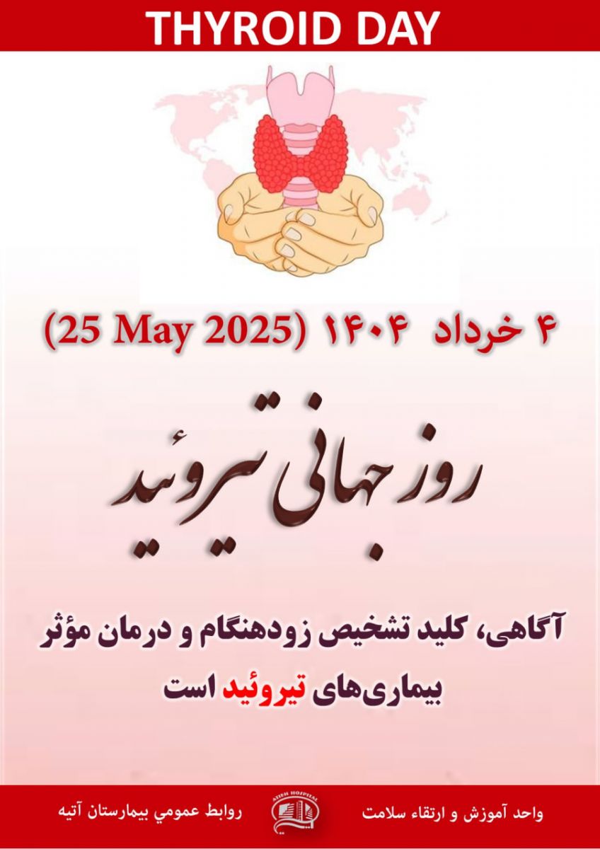 روز جهانی تیروئید هر ساله در ۲۵ مي(۴ خرداد) برگزار میشود و هدف آن افزایش آگاهی عمومی درباره اختلالات تیروئید، تشویق به انجام آزمایشهای غربالگری و حمایت از بیماران است. این روز توسط انجمن تیروئید اروپا (ETA) پایهگذاری شده و با حمایت انجمنهای بینالمللی مانند انجمن تیروئید آمریکا (ATA) و فدراسیون بینالمللی تیروئید (TFI) برگزار میشود.