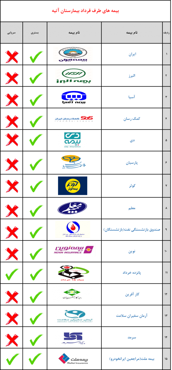 بيمارستان آتيه با بيمه هاي تأمين اجتماعي، خدمات درماني و نيروهاي مسلح طرف قرارداد نمي باشد.