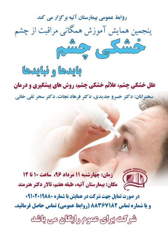 "پنجمين همايش عمومي خشكي چشم با همكاري مشترك روابط عمومي و بخش چشم بيمارستان آتيه روز چهارشنبه 11 مرداد ماه 96 در تالار دكتر هنرمند"