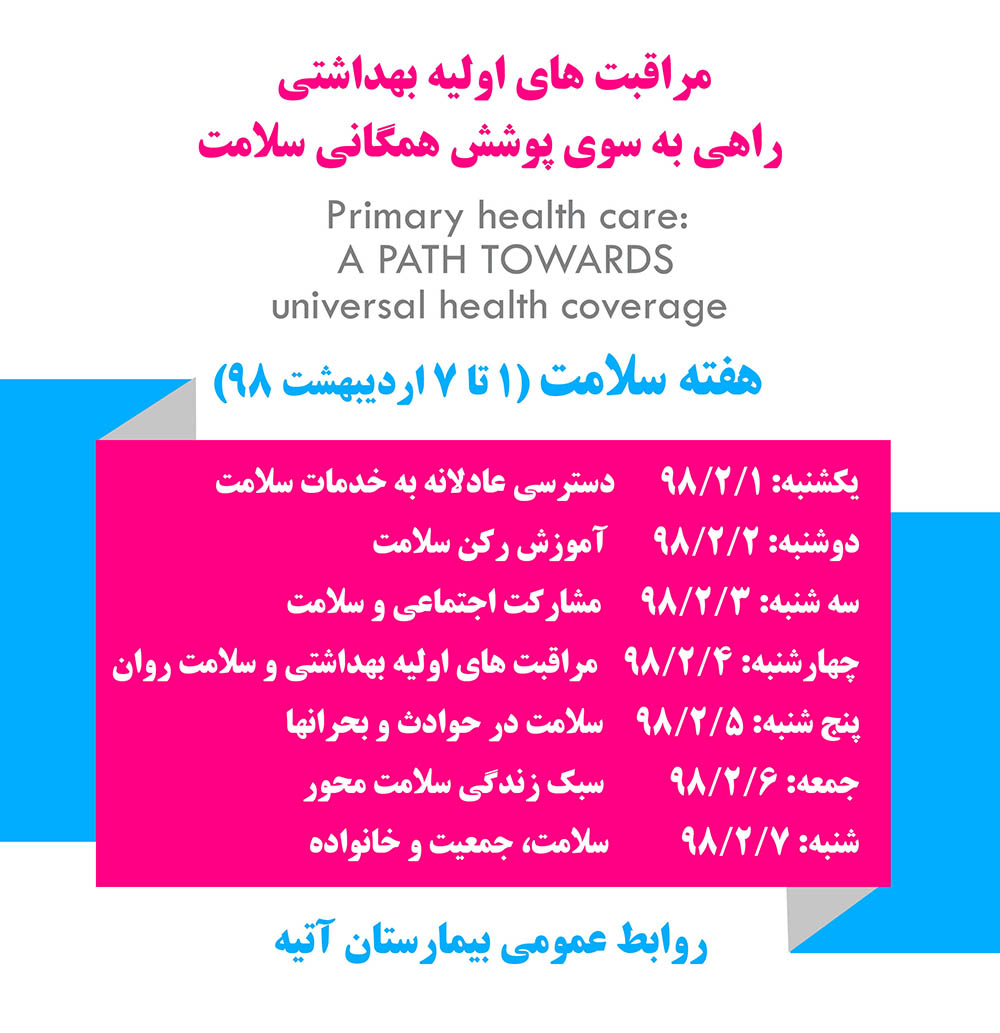 به مناسبت هفته سلامت 1 تا 7 ارديبهشت 98، كلاس آموزشي با عنوان مولفه هاي سلامت، روز دوشنبه دوم ارديبهشت ماه برگزار شد.