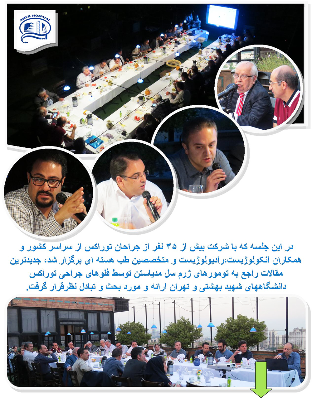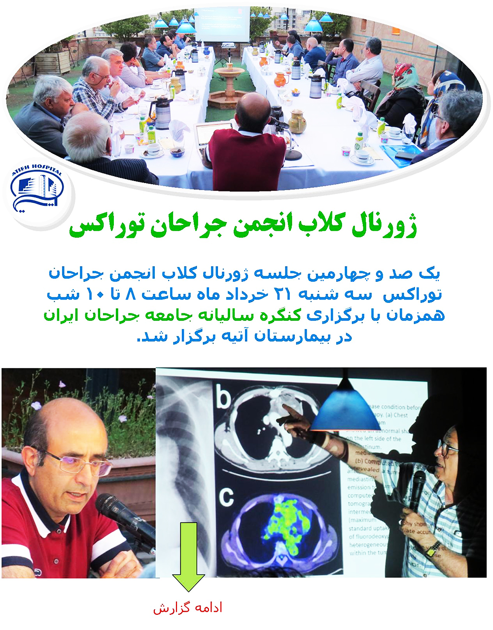 یک صد و چهارمین جلسه ژورنال کلاب انجمن جراحان توراکس سه شنبه ۲۱ خرداد ماه 98 همزمان با برگزاری کنگره سالیانه جامعه جراحان ایران در بیمارستان آتیه برگزار شد. در این جلسه که با شرکت بیش از ۳۵ نفر از جراحان توراکس از سراسر کشور و همکاران انکولوژیست،رادیولوژیست و متخصصین طب هسته ای برگزار شد، جدیدترین مقالات راجع به تومورهای ژرم سل مدیاستن توسط فلوهای جراحی توراکس دانشگاههای شهید بهشتی و تهران ارائه و مورد بحث و تبادل نظر قرار گرفت. همچنین اطلاعات مربوط به جدیدترین روشهای تشخیصی و امکانات درمانی در کشور توسط اساتید مجرب ارائه گردید.