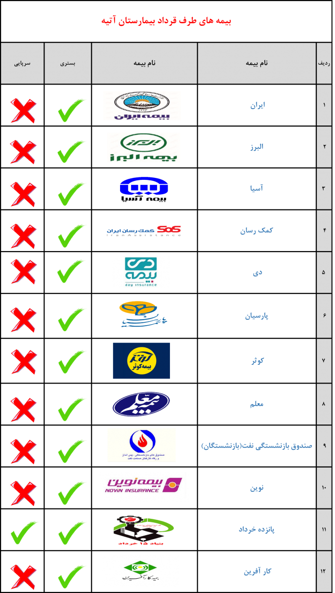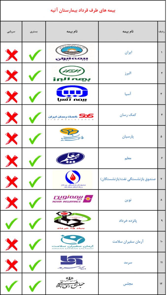 بيمارستان آتيه با بيمه هاي تأمين اجتماعي، خدمات درماني و نيروهاي مسلح طرف قرارداد نمي باشد.