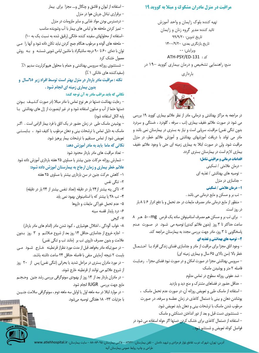 پمفلت آموزشي جهت مراقبت در منزل مادران مشكوك و مبتلا به كوويد 19